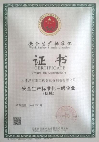 2013年12月我公司被天津市津南區(qū)安全生產(chǎn)管理局認定為安全生產(chǎn)標(biāo)準(zhǔn)化三級企業(yè)(機械)并頒發(fā)證書。